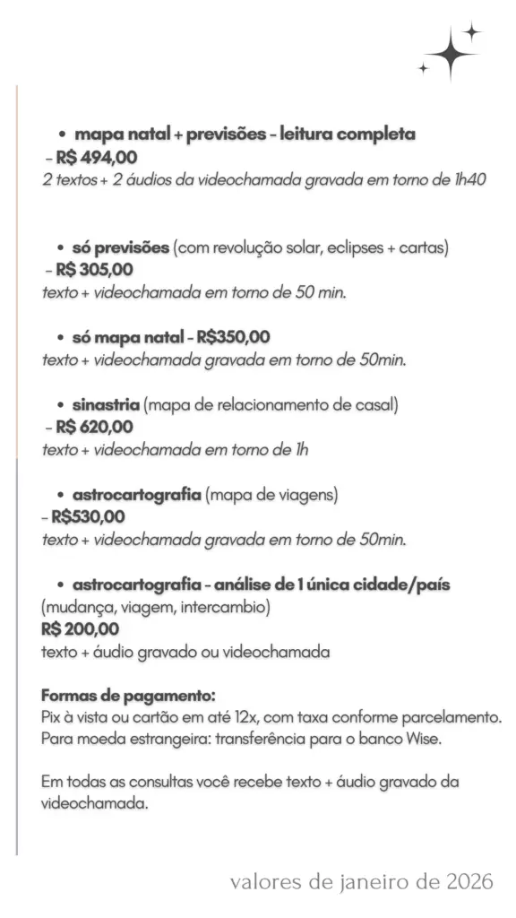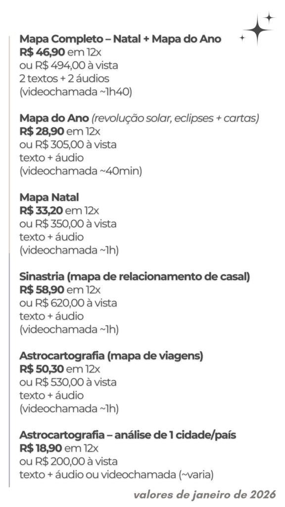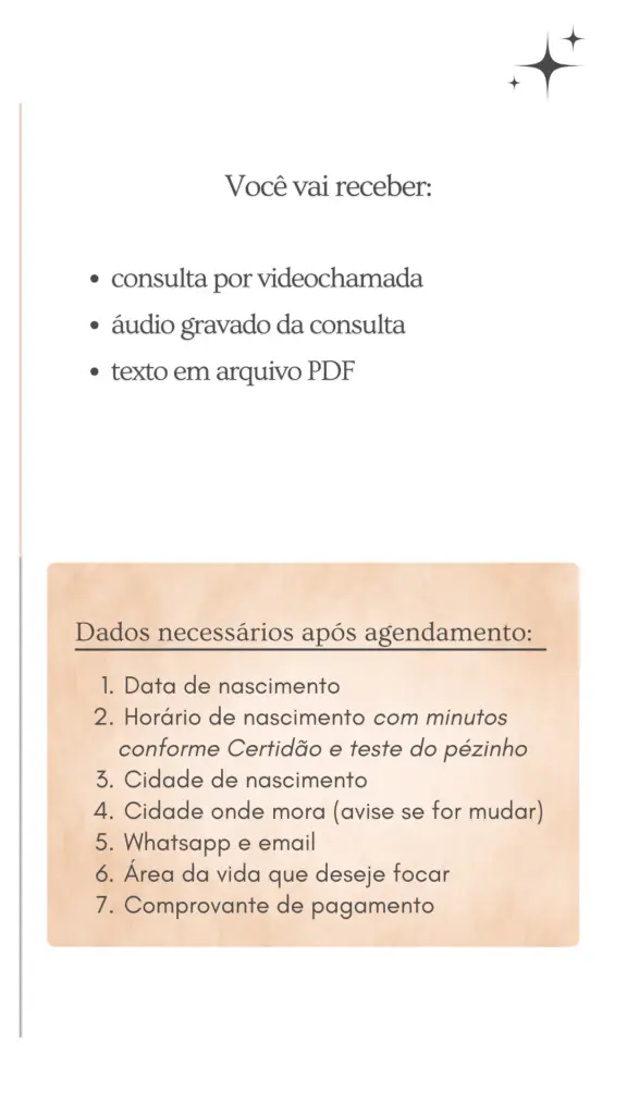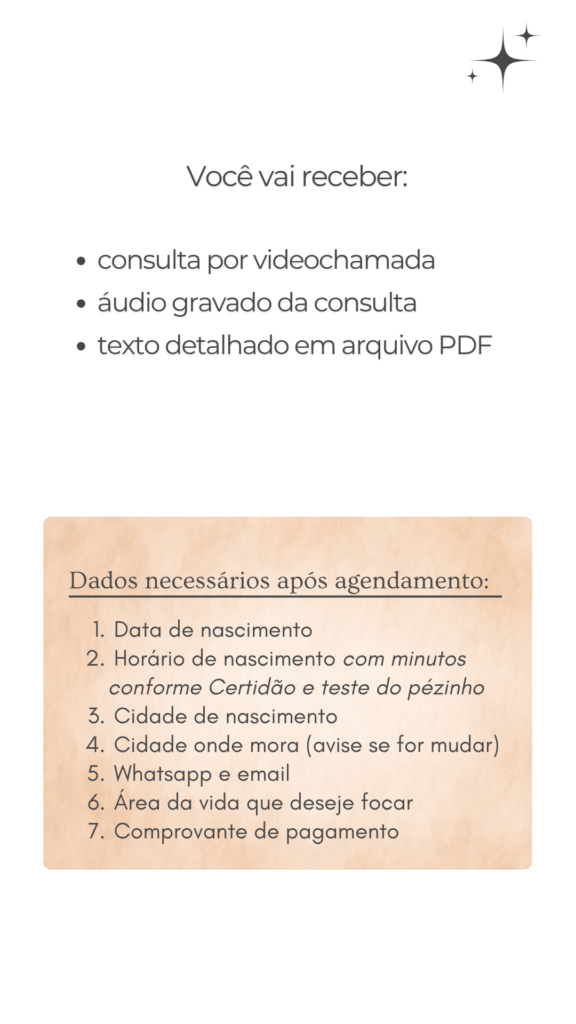 Analisamos o seu mapa natal e você pode trazer questões sobre vida pessoal, relacionamentos, trabalho e decisões importantes.